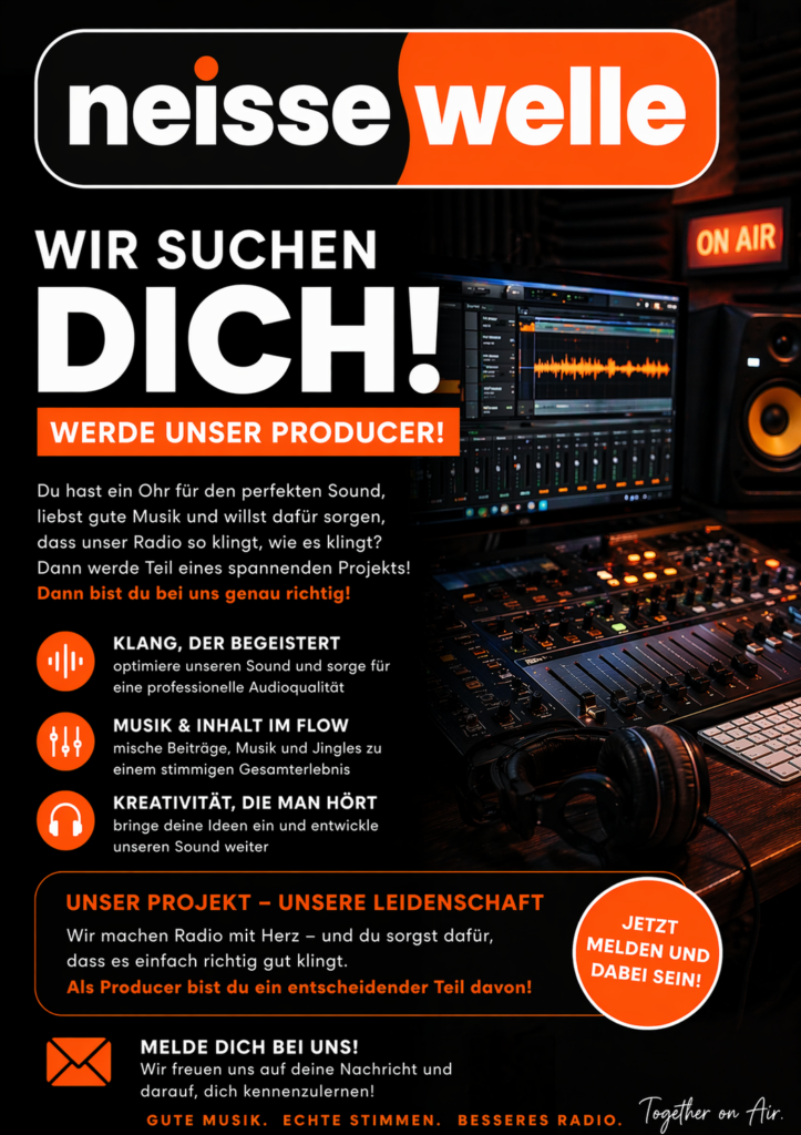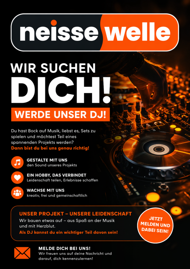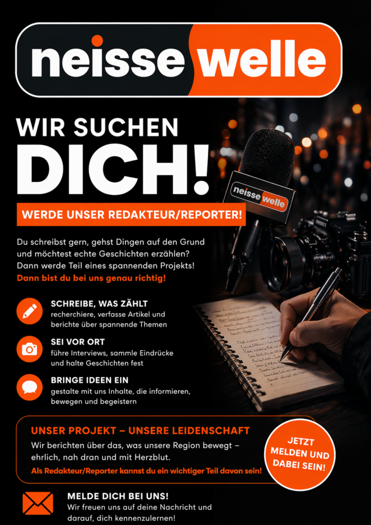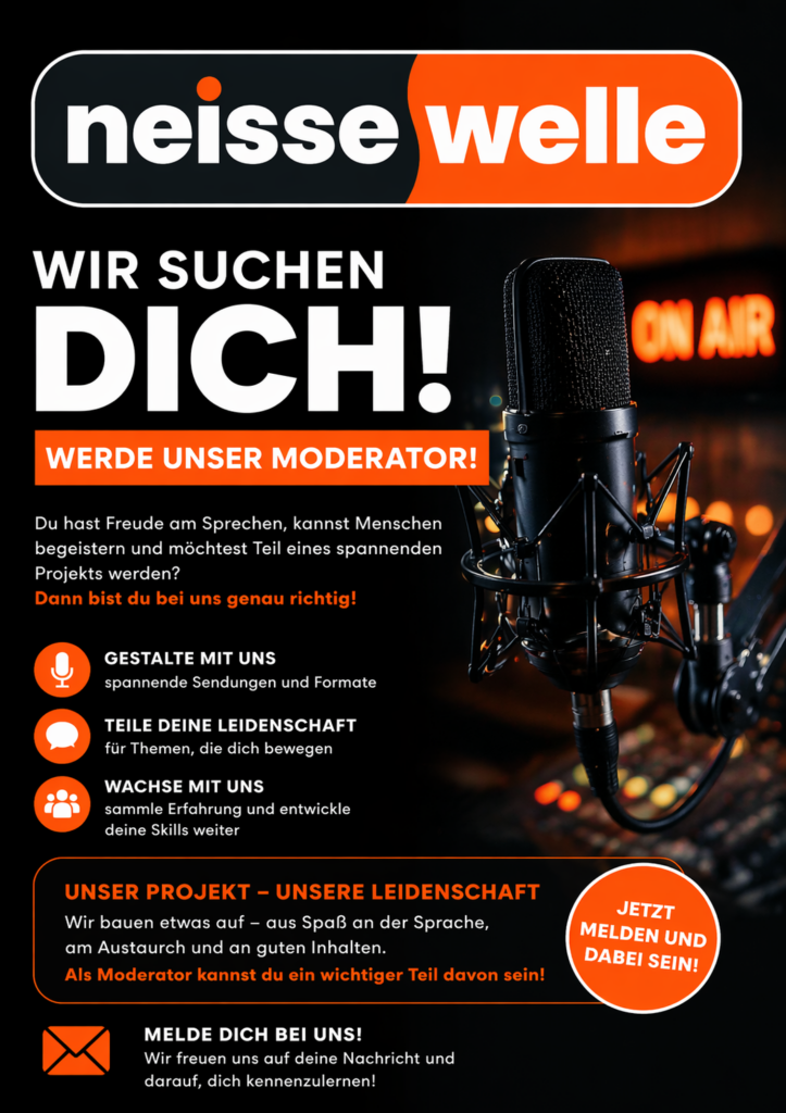 Werde Teil unseres Teams und gestalte spannende Inhalte aktiv mit! Schreib uns eine Mail an info@neissewelle.de.